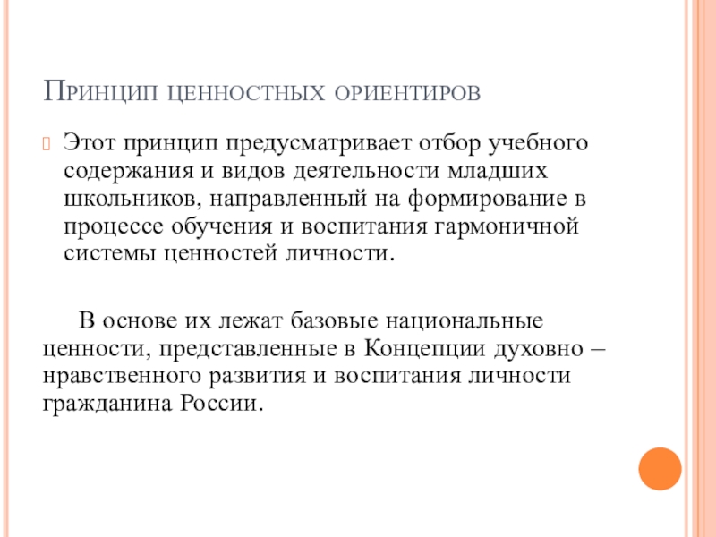 В основе их лежат базовые национальные ценности, представленные в Концепции духовно –нравственного развития и воспитания личности гражданина России.