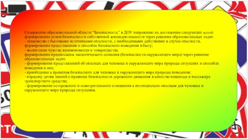 Слайд 5Содержание образовательной области “Безопасность” в ДОУ направлено на достижение следующих целей: