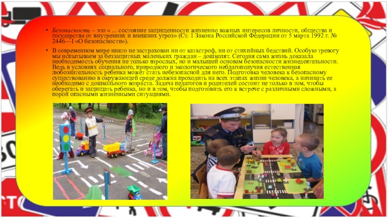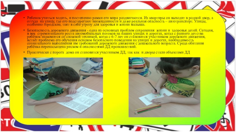 Безопасность дорожного движения - одна из основных проблем сохранения жизни и здоровья детей. Сегодня, в век стремительного роста автомобильных потоков на наших улицах и дорогах, когда с раннего детства ребёнок знакомится со сложной техникой, когда с 6-7 лет он становится участником дорожного движения, встаёт проблема его обучения основам безопасного поведения на улицах и дорогах, необходимость сознательного выполнения им требований дорожного движения с дошкольного возраста. Среда обитания ребёнка перенасыщена риском и опасностями ДД происшествий.