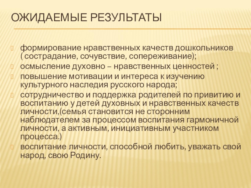 сотрудничество и поддержка родителей по привитию и воспитанию у детей духовных и нравственных качеств личности,(семья становится не сторонним наблюдателем за процессом воспитания гармоничной личности, а активным, инициативным участником процесса.)