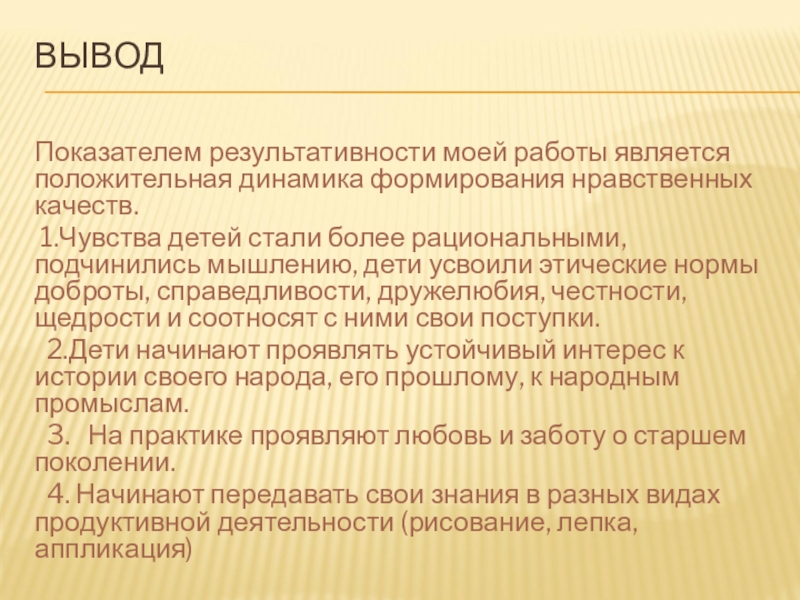 детей стали более рациональными, подчинились мышлению, дети усвоили этические нормы доброты, справедливости, дружелюбия, честности, щедрости и соотносят с ними свои поступки.
