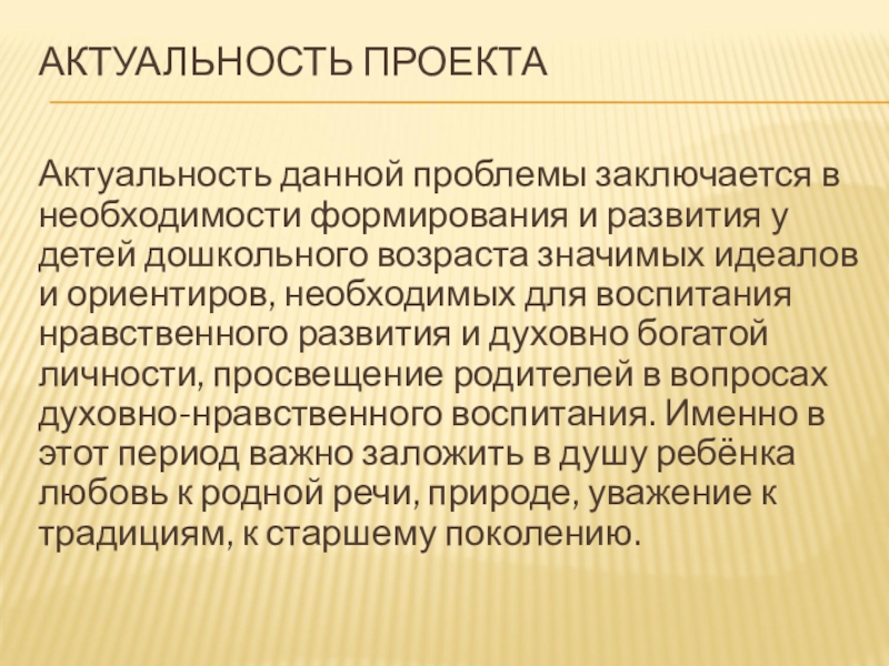 детей дошкольного возраста значимых идеалов и ориентиров, необходимых для воспитания нравственного развития и духовно богатой личности, просвещение родителей в вопросах духовно-нравственного воспитания. Именно в этот период важно заложить в душу ребёнка любовь к родной речи, природе, уважение к традициям, к старшему поколению.