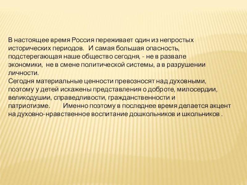 Сегодня материальные ценности превозносят над духовными, поэтому у детей искажены представления ο доброте, милосердии, великодушии, справедливости, гражданственности и патриотизме. Именно поэтому в последнее время делается акцент на духовно-нравственное воспитание дошкольников и школьников .
