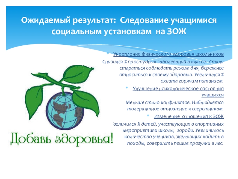 Ожидаемый результат: Следование учащимися социальным установкам на ЗОЖ