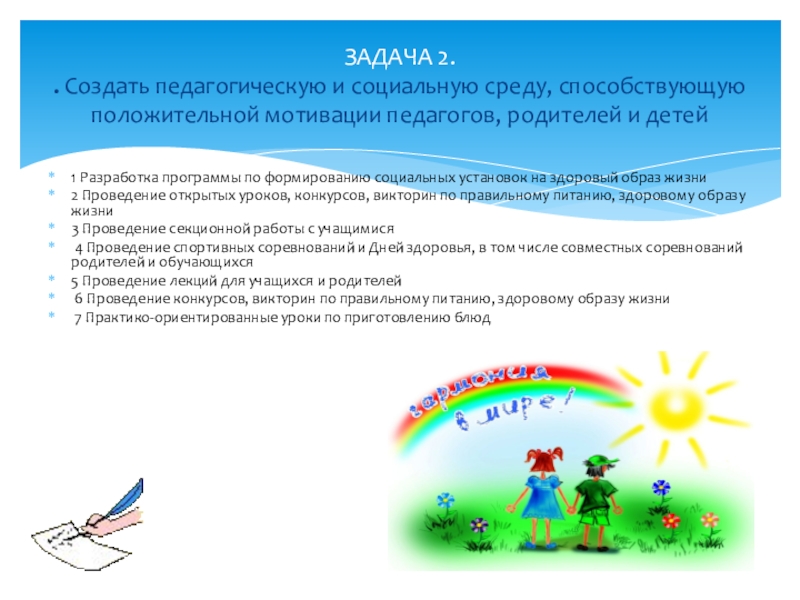 . Создать педагогическую и социальную среду, способствующую положительной мотивации педагогов, родителей и детей