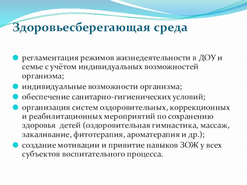 Здоровьесберегающая среда регламентация режимов жизнедеятельности в ДОУ и семье с учётом индивидуальных возможностей организма;индивидуальные возможности организма;обеспечение санитарно-гигиенических