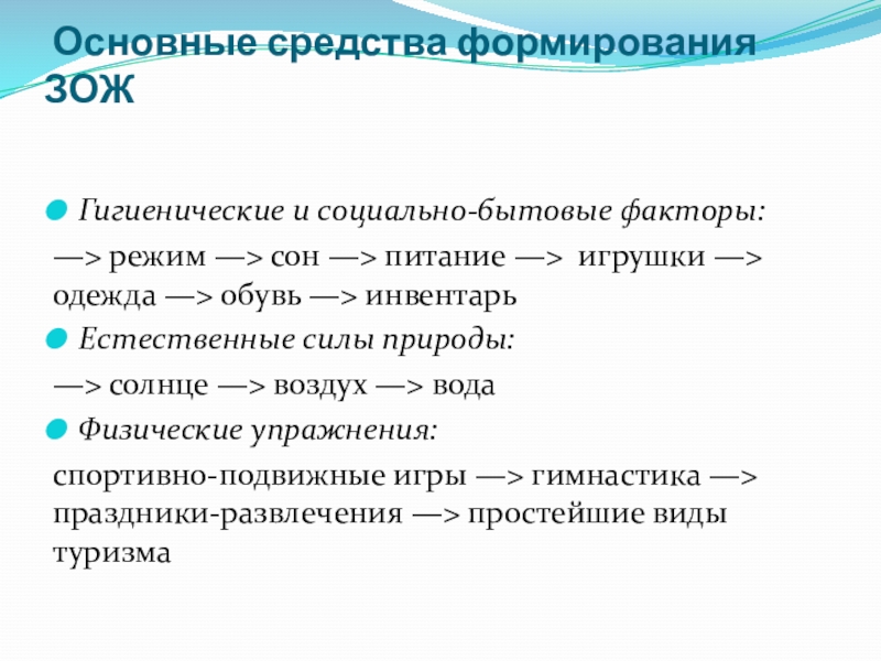 Основные средства формирования ЗОЖ  Гигиенические и социально-бытовые факторы:—> режим —> сон —> питание —>