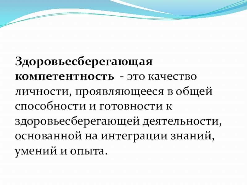 Здоровьесберегающая компетентность - это качество личности, проявляющееся в общей способности и готовности к здоровьесберегающей деятельности, основанной на интеграции знаний, умений и опыта.