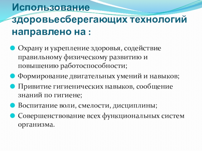Слайд 7 Использование здоровьесберегающих технологий направлено на :