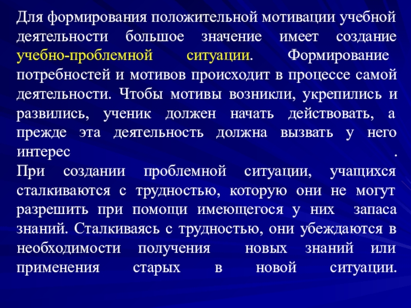 Для формирования положительной мотивации учебной деятельности большое значение имеет создание учебно-проблемной