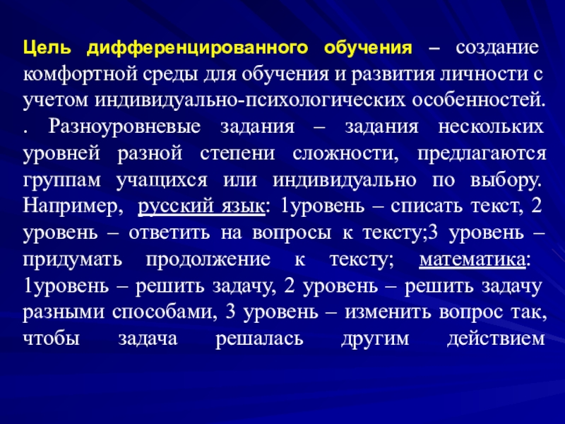 личности с учетом индивидуально-психологических особенностей. . Разноуровневые задания – задания нескольких уровней разной степени сложности, предлагаются группам учащихся или индивидуально по выбору. Например, русский язык: 1уровень – списать текст, 2 уровень – ответить на вопросы к тексту;3 уровень – придумать продолжение к тексту; математика: 1уровень – решить задачу, 2 уровень – решить задачу разными способами, 3 уровень – изменить вопрос так, чтобы задача решалась другим действием