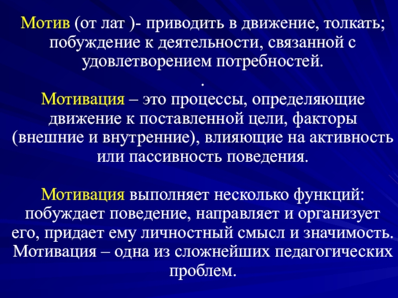 Мотивация – это процессы, определяющие движение к поставленной цели, факторы (внешние и внутренние), влияющие на активность или пассивность поведения.