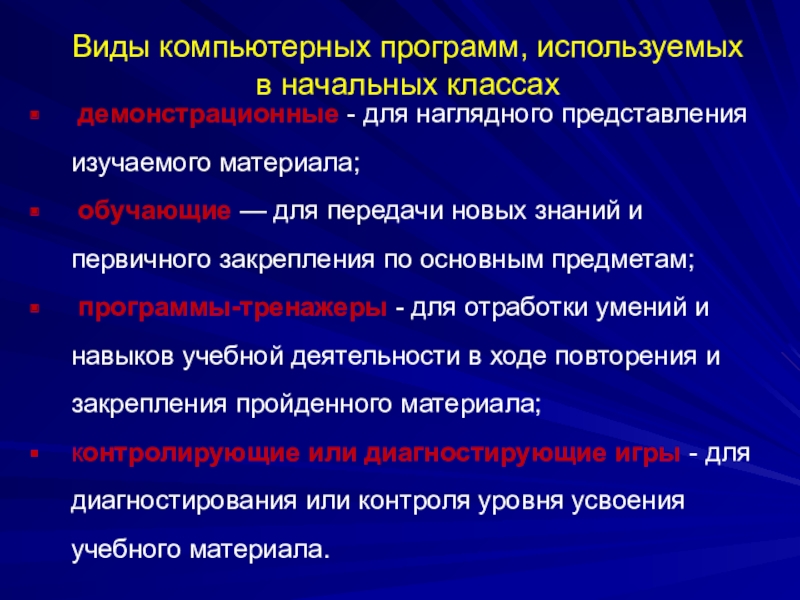 программы-тренажеры - для отработки умений и навыков учебной деятельности в ходе повторения и закрепления пройденного материала;