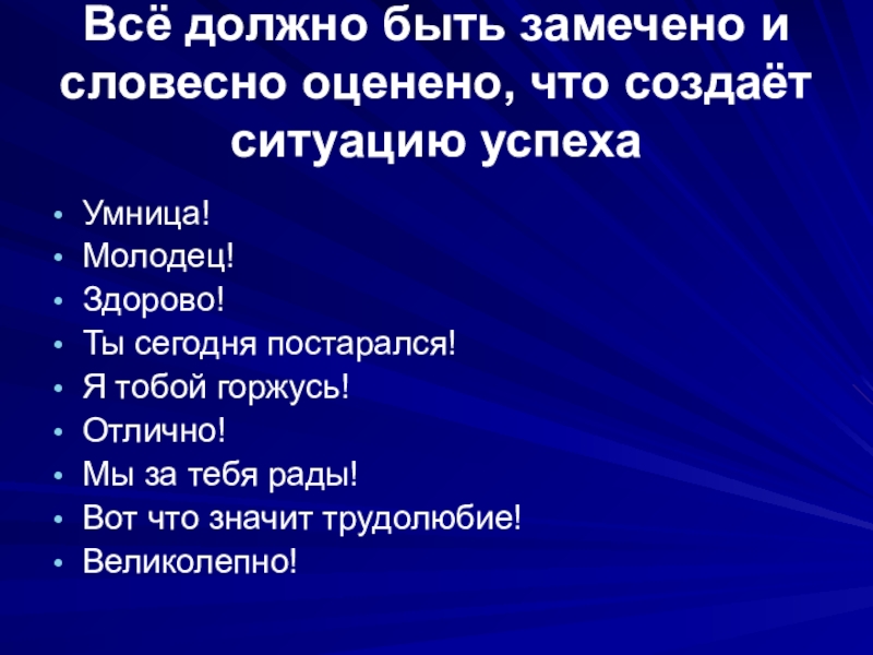 Слайд 34Всё должно быть замечено и словесно оценено, что создаёт ситуацию успеха