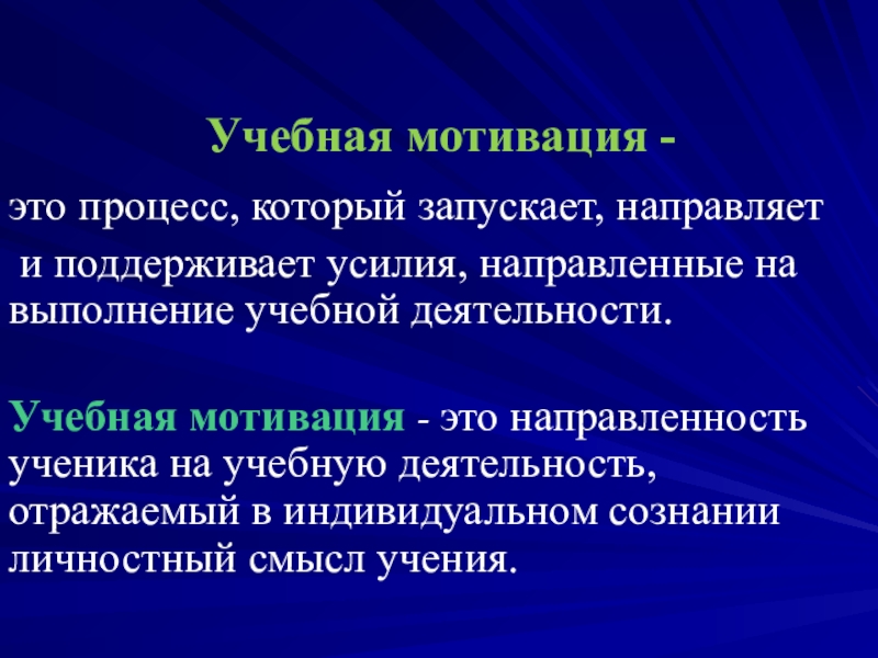 Учебная мотивация - это направленность ученика на учебную деятельность, отражаемый в индивидуальном сознании личностный смысл учения.