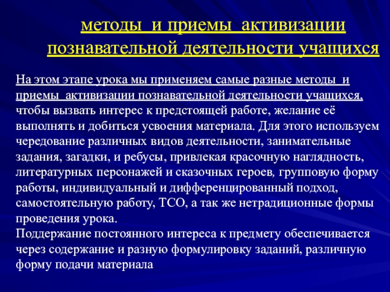 применяем самые разные методы и приемы активизации познавательной деятельности учащихся, чтобы вызвать интерес к предстоящей работе, желание её выполнять и добиться усвоения материала. Для этого используем чередование различных видов деятельности, занимательные задания, загадки, и ребусы, привлекая красочную наглядность, литературных персонажей и сказочных героев, групповую форму работы, индивидуальный и дифференцированный подход, самостоятельную работу, ТСО, а так же нетрадиционные формы проведения урока.