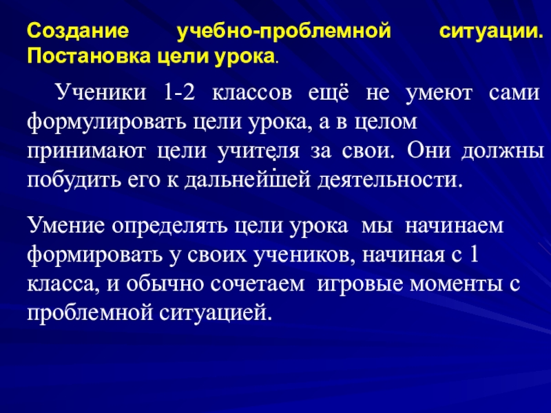 Умение определять цели урока мы начинаем формировать у своих учеников, начиная с 1 класса, и обычно сочетаем игровые моменты с проблемной ситуацией.
