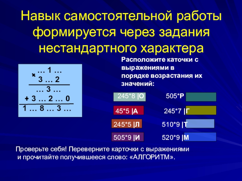 Карточки подбираются с учётом возраста детей .Работа с карточками помогает ученикам самостоятельно проверить уровень своих знаний, т.е. провести самооценку, приучает к самостоятельности, развивает мышление, познавательные способности.