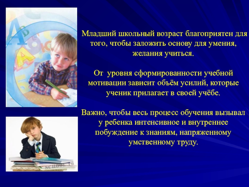 Важно, чтобы весь процесс обучения вызывал у ребенка интенсивное и внутреннее побуждение к знаниям, напряженному умственному труду.