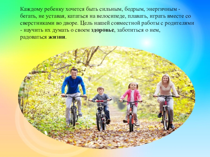 кататься на велосипеде, плавать, играть вместе со сверстниками во дворе. Цель нашей совместной работы с родителями - научить их думать о своем здоровье, заботиться о нем, радоваться жизни.