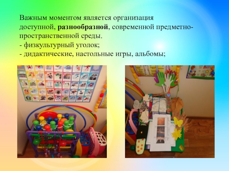 Слайд 19Важным моментом является организация доступной, разнообразной, современной предметно-пространственной среды.