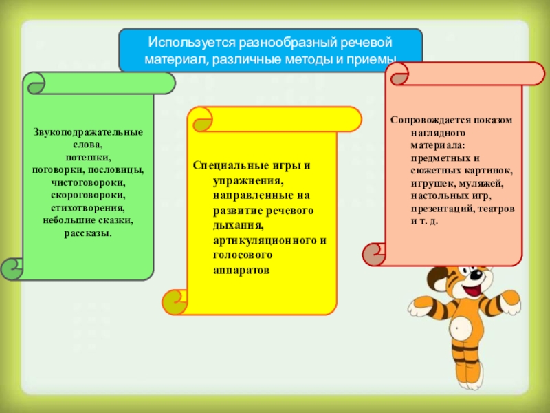 Сопровождается показом наглядного материала: предметных и сюжетных картинок, игрушек, муляжей, настольных игр, презентаций, театров и т. д.
