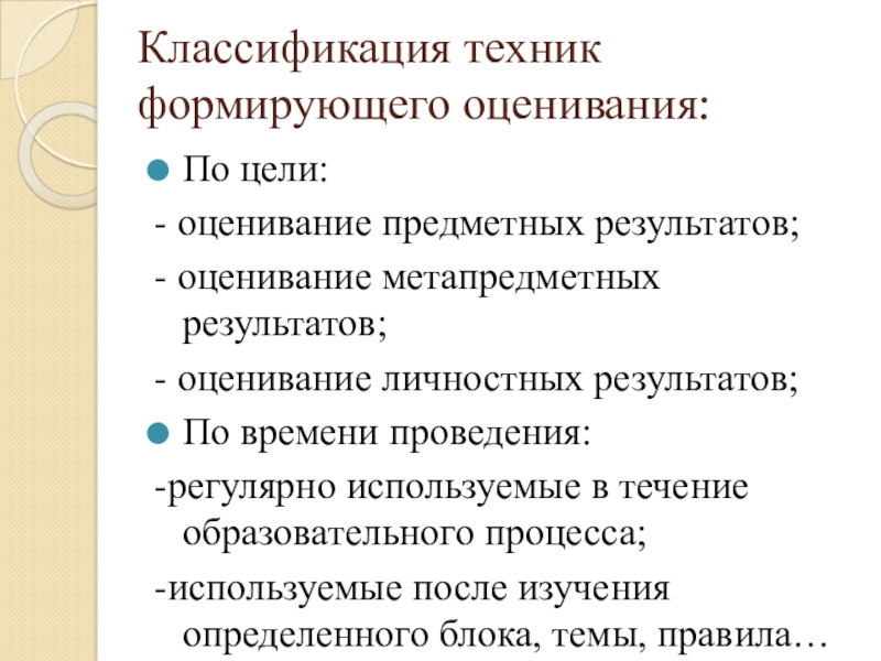 Слайд 7Классификация техник формирующего оценивания: