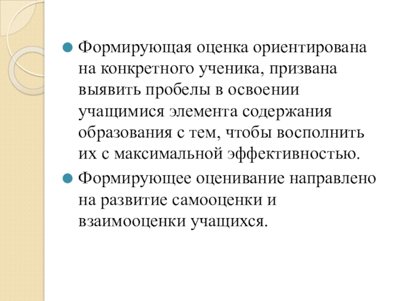 Слайд 4Формирующая оценка ориентирована на конкретного ученика, призвана выявить пробелы в освоении