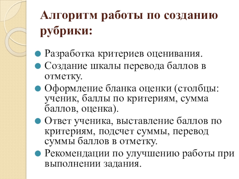 Ответ ученика, выставление баллов по критериям, подсчет суммы, перевод суммы баллов в отметку.