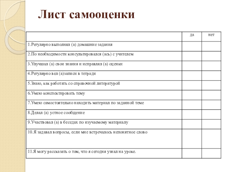 Лист самооценки и индивидуальных достижений по предметам