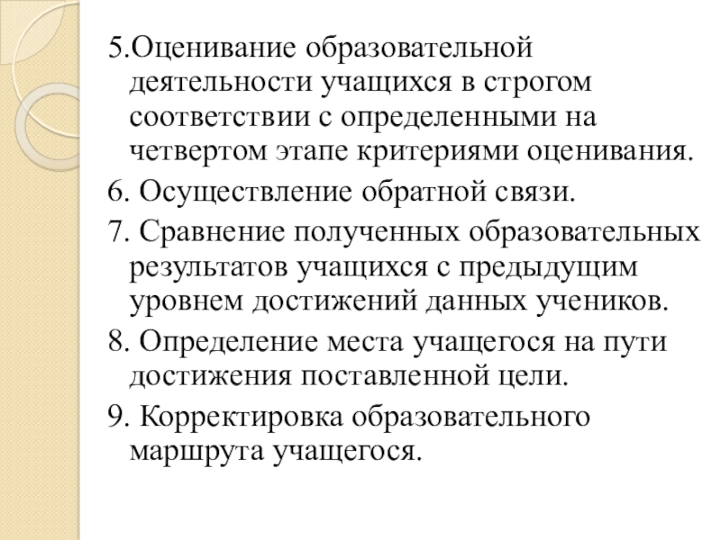 Слайд 105.Оценивание образовательной деятельности учащихся в строгом соответствии с определенными на четвертом этапе