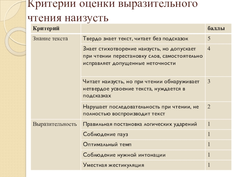 Слайд 15Критерии оценки выразительного чтения наизусть