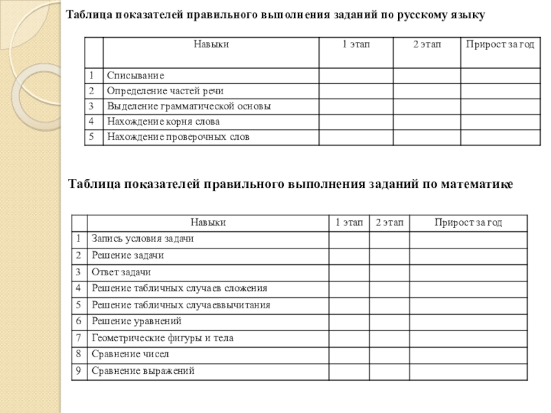 Слайд 25Таблица показателей правильного выполнения заданий по русскому языку