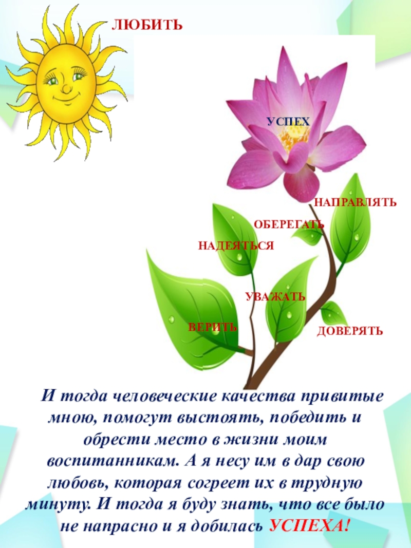ЛЮБИТЬНАПРАВЛЯТЬОБЕРЕГАТЬВЕРИТЬНАДЕЯТЬСЯУВАЖАТЬДОВЕРЯТЬУСПЕХ  И тогда человеческие качества привитые мною, помогут выстоять, победить и обрести место в жизни моим