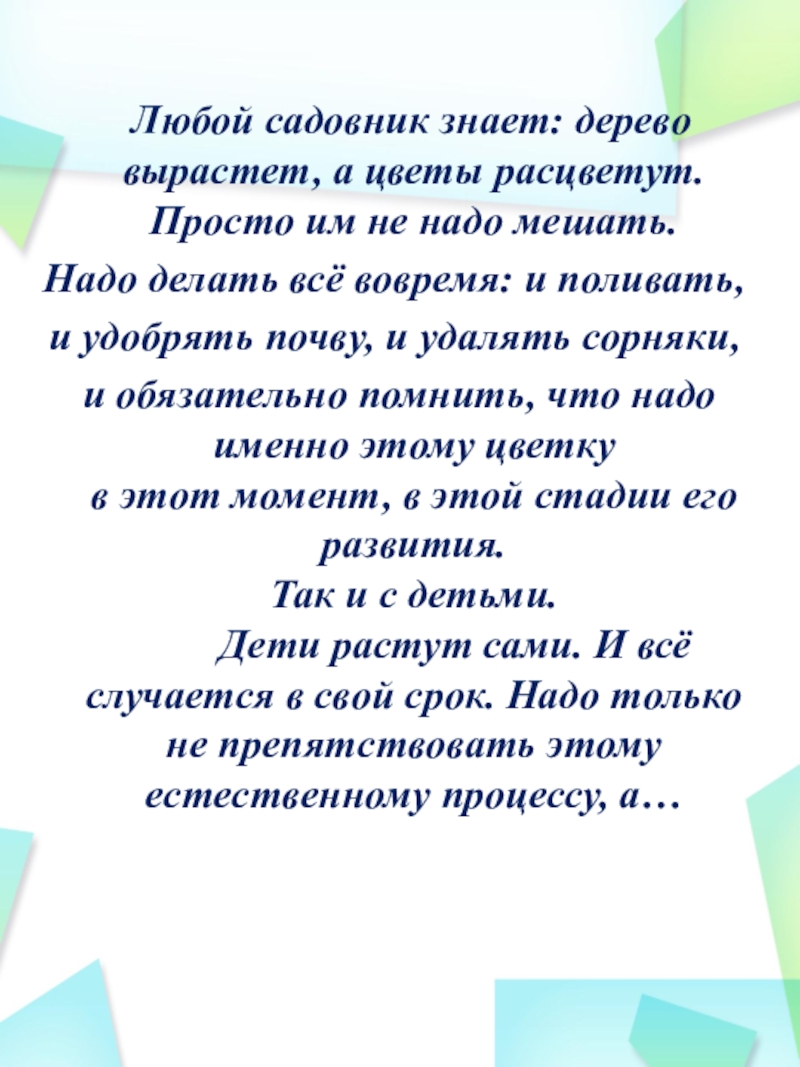 и обязательно помнить, что надо именно этому цветку в этот момент, в этой стадии его развития. Так и с детьми.         Дети растут сами. И всё случается в свой срок. Надо только не препятствовать этому естественному процессу, а…