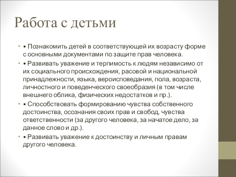 • Развивать уважение и терпимость к людям независимо от их социального происхождения, расовой и национальной принадлежности, языка, вероисповедания, пола, возраста, личностного и поведенческого своеобразия (в том числе внешнего облика, физических недостатков и пр.).