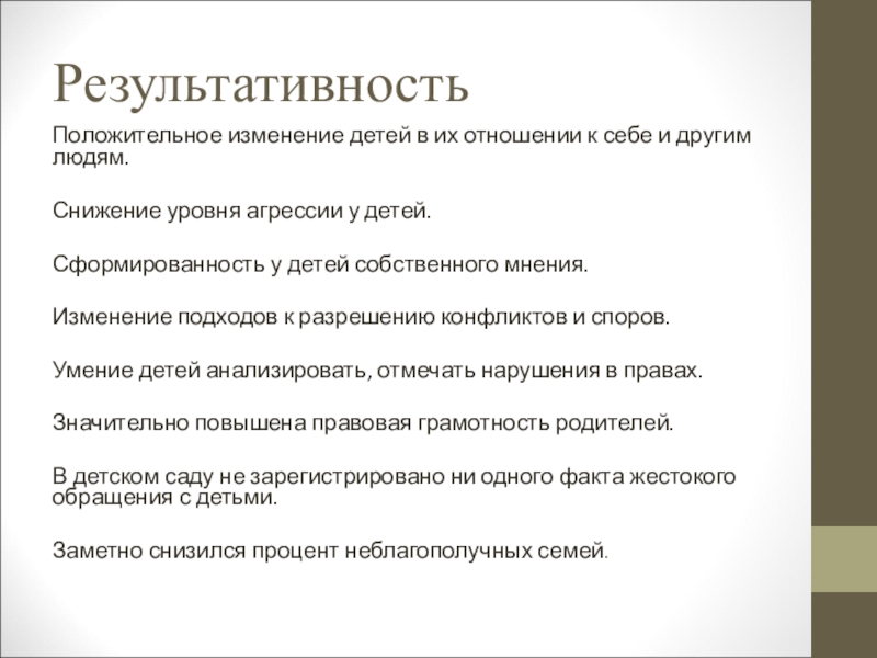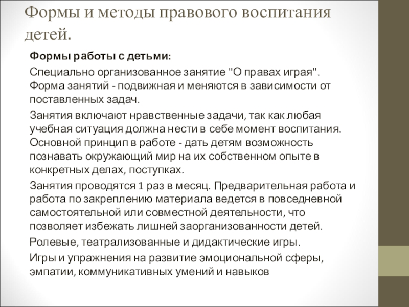 зрелых, свободных личностях, обладающих правовыми знаниями. Воспитать такие личности возможно лишь в условиях соблюдения правовых норм, исключающих нарушение прав и достоинств детей.