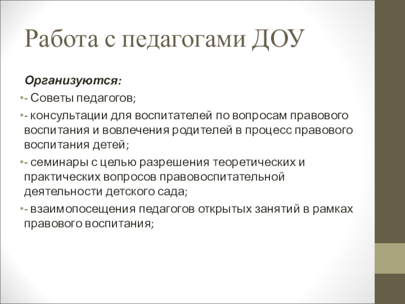 - семинары с целью разрешения теоретических и практических вопросов правовоспитательной деятельности детского сада;
