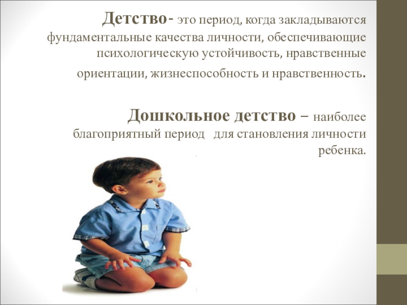 Слайд 2Детство- это период, когда закладываются фундаментальные качества личности, обеспечивающие психологическую устойчивость,