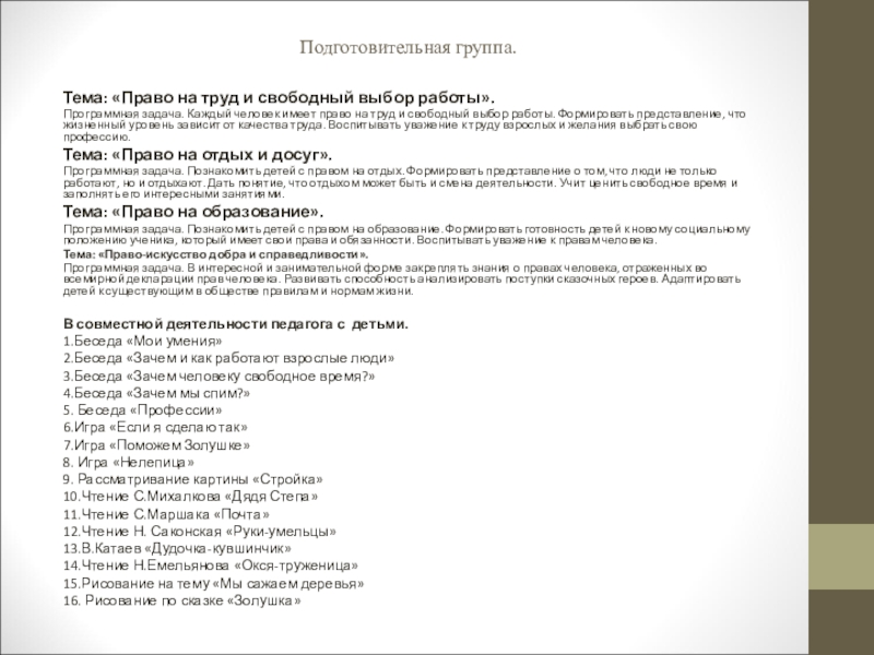 человек имеет право на труд и свободный выбор работы. Формировать представление, что жизненный уровень зависит от качества труда. Воспитывать уважение к труду взрослых и желания выбрать свою профессию.