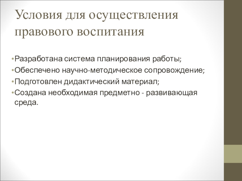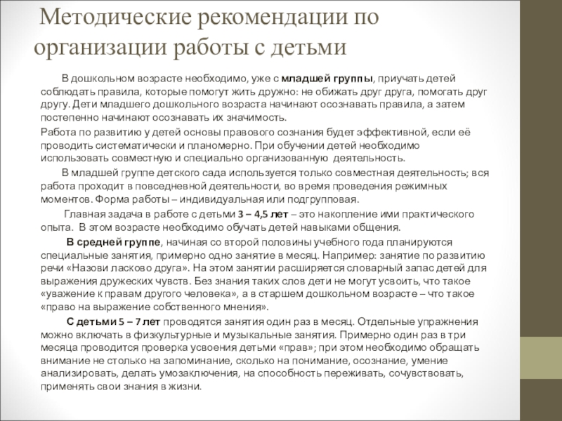 Работа по развитию у детей основы правового сознания будет эффективной, если её проводить систематически и планомерно. При обучении детей необходимо использовать совместную и специально организованную деятельность.