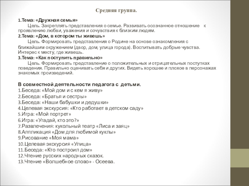 В средней группе, начиная со второй половины учебного года планируются специальные занятия, примерно одно занятие в месяц. Например: занятие по развитию речи «Назови ласково друга». На этом занятии расширяется словарный запас детей для выражения дружеских чувств. Без знания таких слов дети не могут усвоить, что такое «уважение к правам другого человека», а в старшем дошкольном возрасте – что такое «право на выражение собственного мнения».