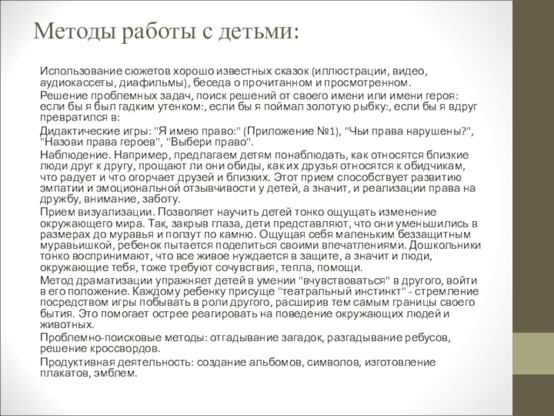 Наблюдение. Например, предлагаем детям понаблюдать, как относятся близкие люди друг к другу, прощают ли они обиды, как их друзья относятся к обидчикам, что радует и что огорчает друзей и близких. Этот прием способствует развитию эмпатии и эмоциональной отзывчивости у детей, а значит, и реализации права на дружбу, внимание, заботу.