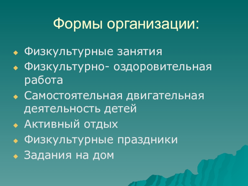 Формы организации:Физкультурные занятияФизкультурно- оздоровительная работаСамостоятельная двигательная деятельность детейАктивный отдыхФизкультурные праздникиЗадания на дом