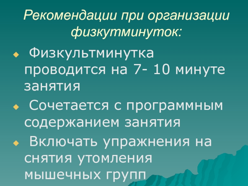 Рекомендации при организации физкутминуток: Физкультминутка проводится на 7- 10 минуте занятия Сочетается с программным содержанием занятия Включать