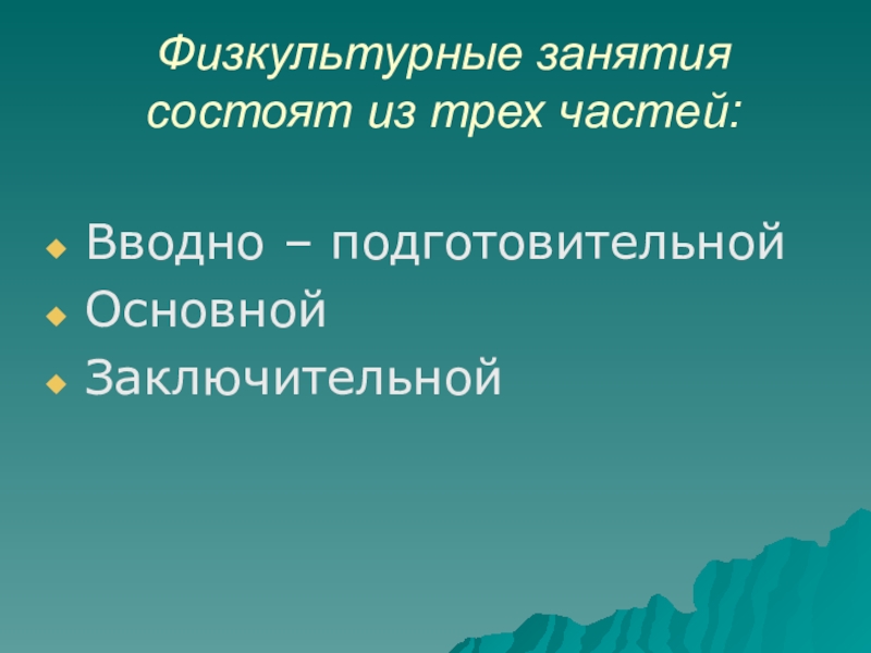 Слайд 5Физкультурные занятия состоят из трех частей:
