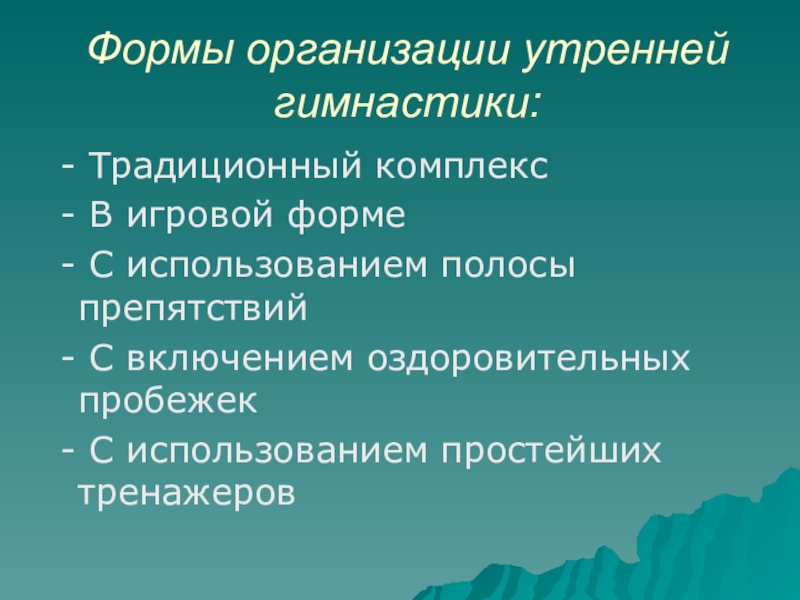 Формы организации утренней гимнастики: - Традиционный комплекс - В игровой форме - С использованием полосы препятствий -
