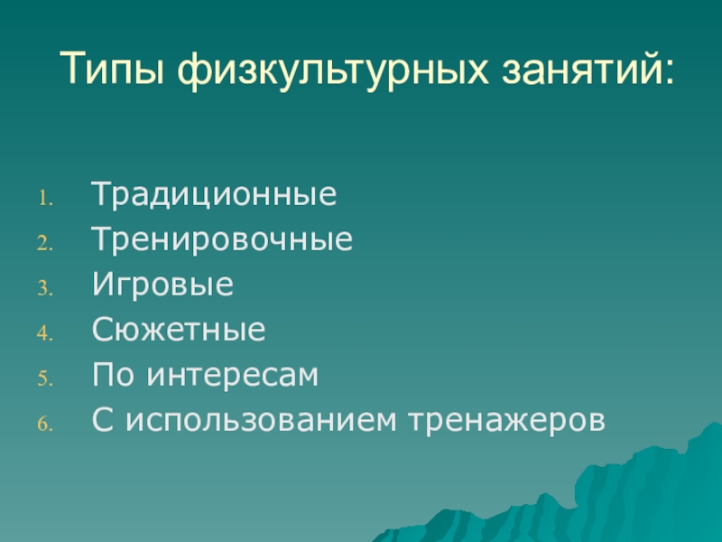 Типы физкультурных занятий:ТрадиционныеТренировочныеИгровыеСюжетныеПо интересамС использованием тренажеров
