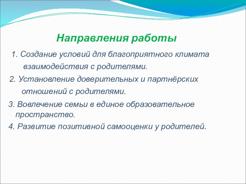1. Создание условий для благоприятного климата взаимодействия с родителями.