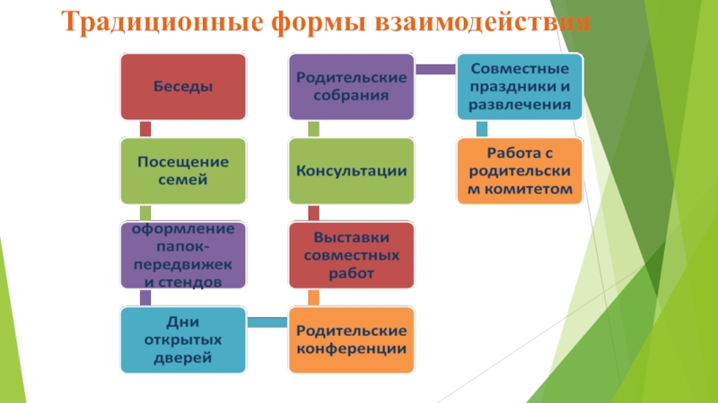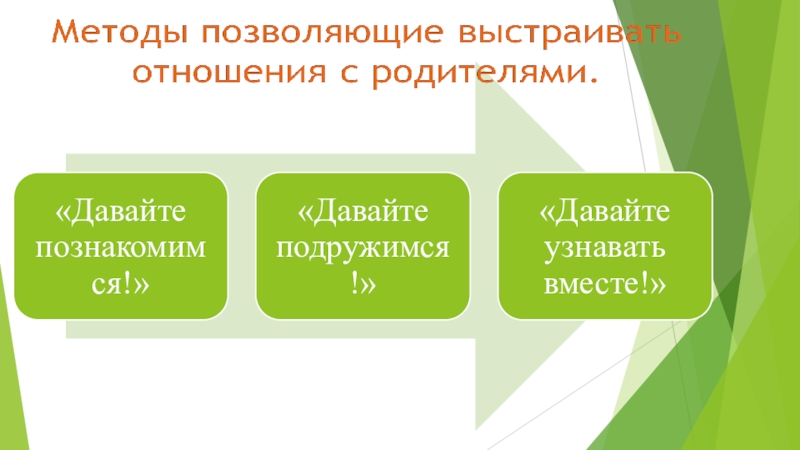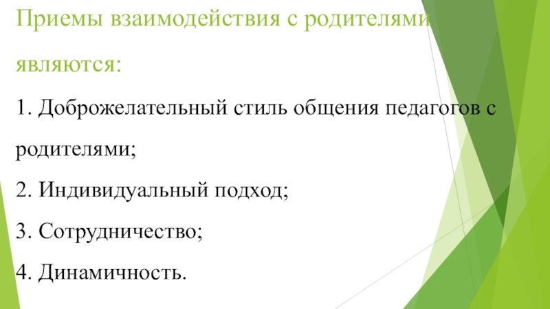 Приемы взаимодействия с родителями являются: 1. Доброжелательный стиль общения педагогов с родителями; 2. Индивидуальный подход; 3. Сотрудничество;